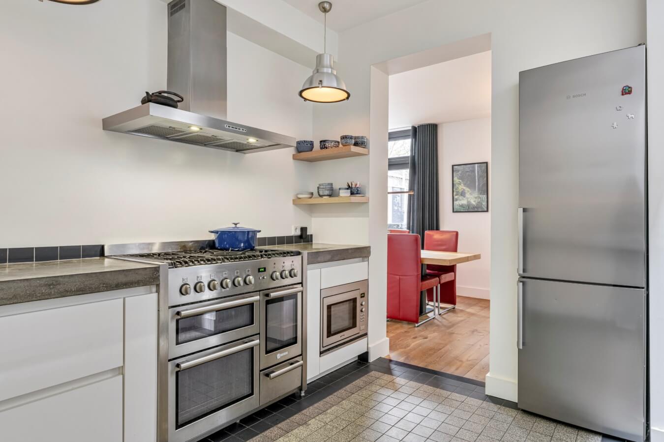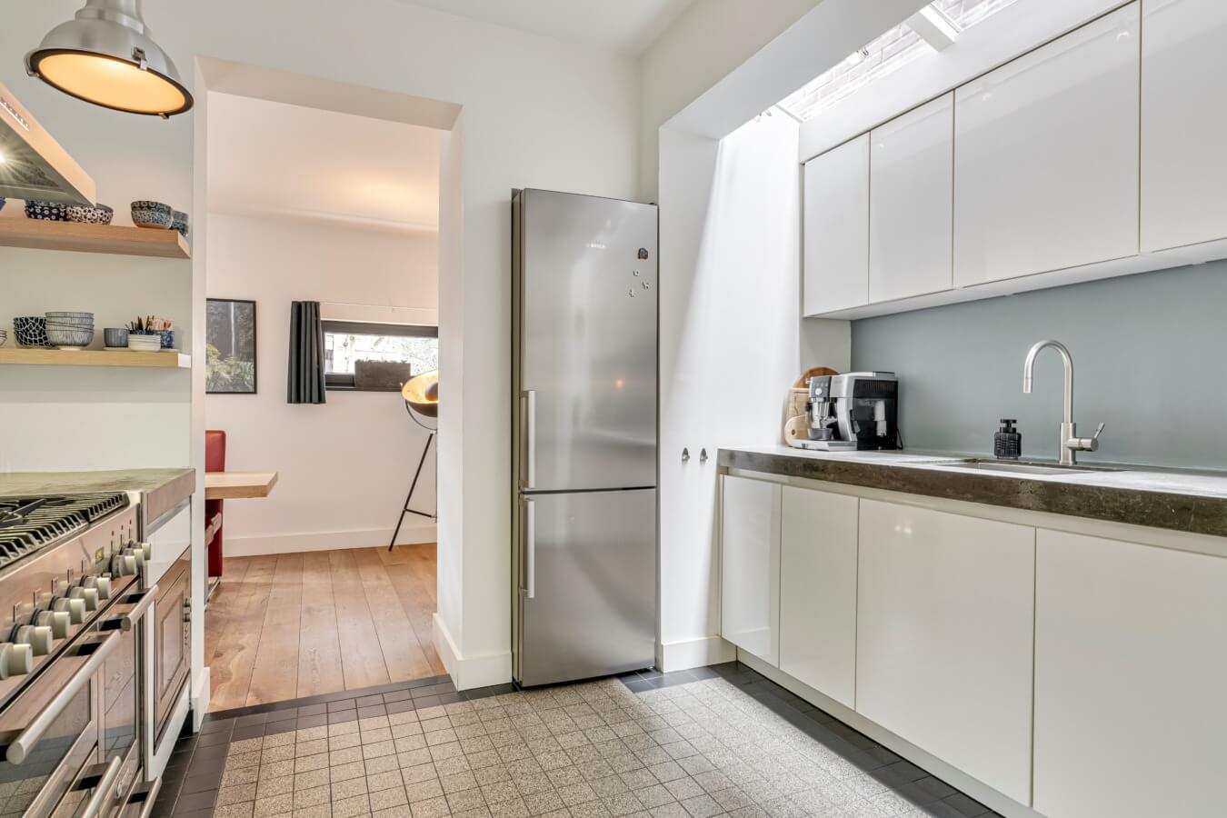 Sfeervolle moderne keuken, is een ware lust voor de echte kookliefhebber, met extra daglicht door de lichtstraat boven het aanrecht. De keuken is voorzien van hoogwaardige apparatuur, zoals het indrukwekkende NEFF fornuis met zes pitten en drie ovens, de Boretti afzuigkap en SMEG apparatuur maken dit een droom voor een thuiskok. Vanuit de keuken is er bovendien toegang tot een praktische kelder, ideaal voor provisie en extra opslag.