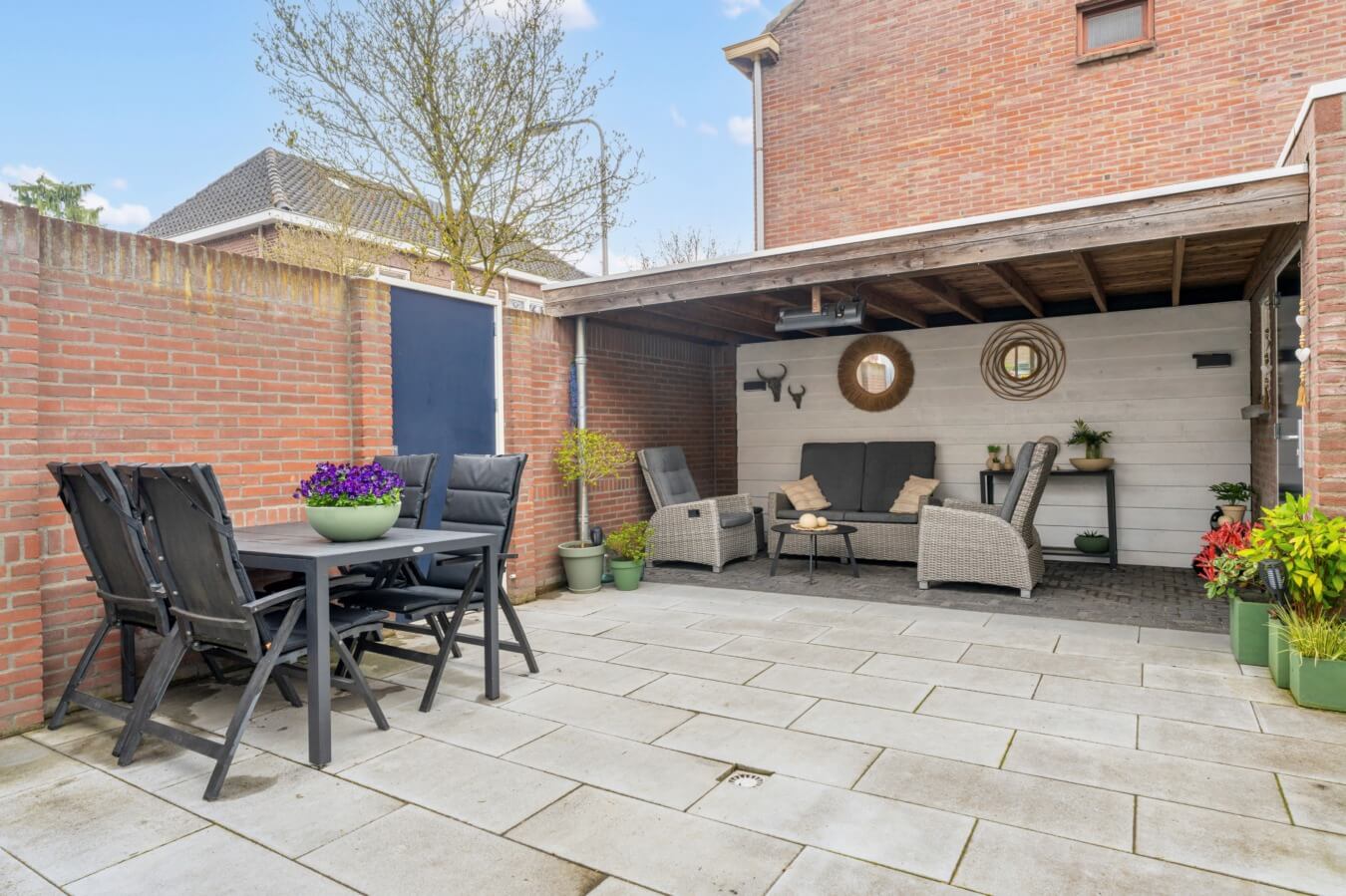 • Fraai aangelegde tuin met berging, overkapping en achterom
