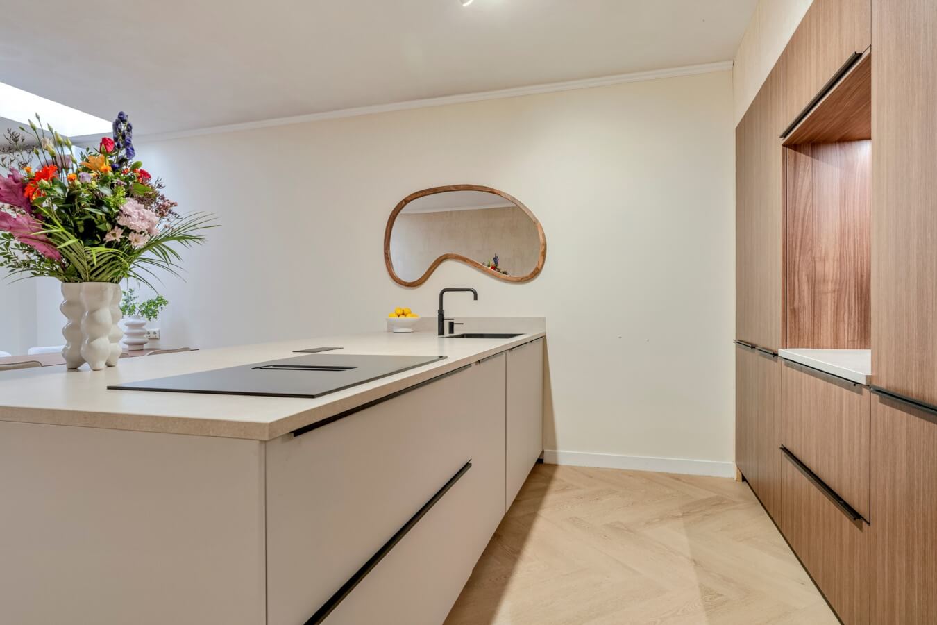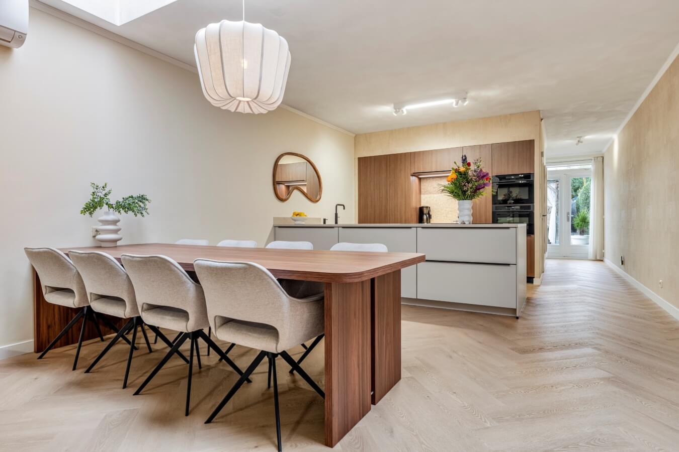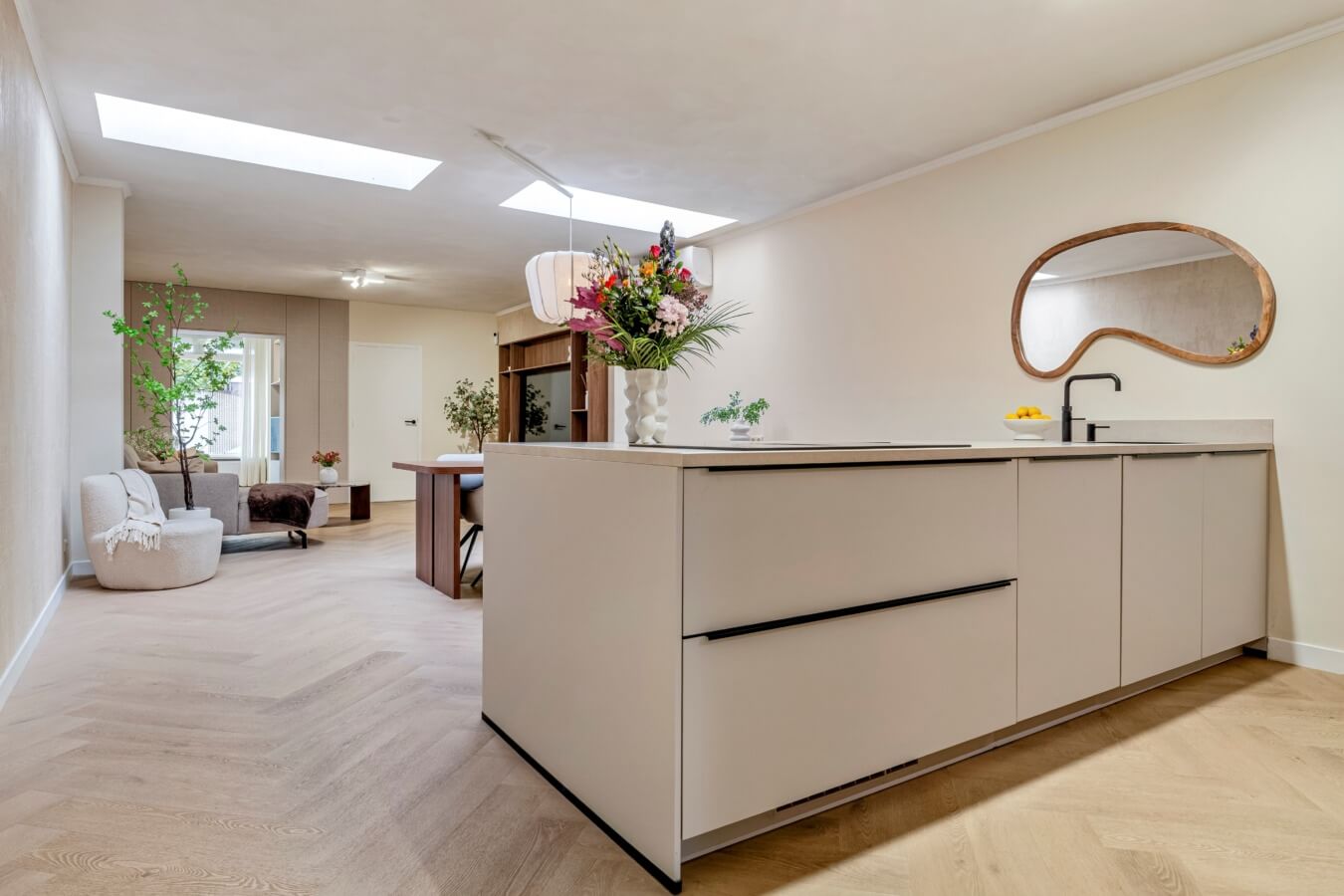 Wauw. In de living weet je in eerste instantie niet waar je moet kijken. De hoogwaardige features, de strak gestucte wanden, de prachtige visgraatvloer, de bakken aan lichtinval door de lichtstraten, de waanzinnige styling en de open opstelling die ervoor zorgt dat de verschillende gedeelten toch verbonden blijven: de ruimte heeft het allemaal.
