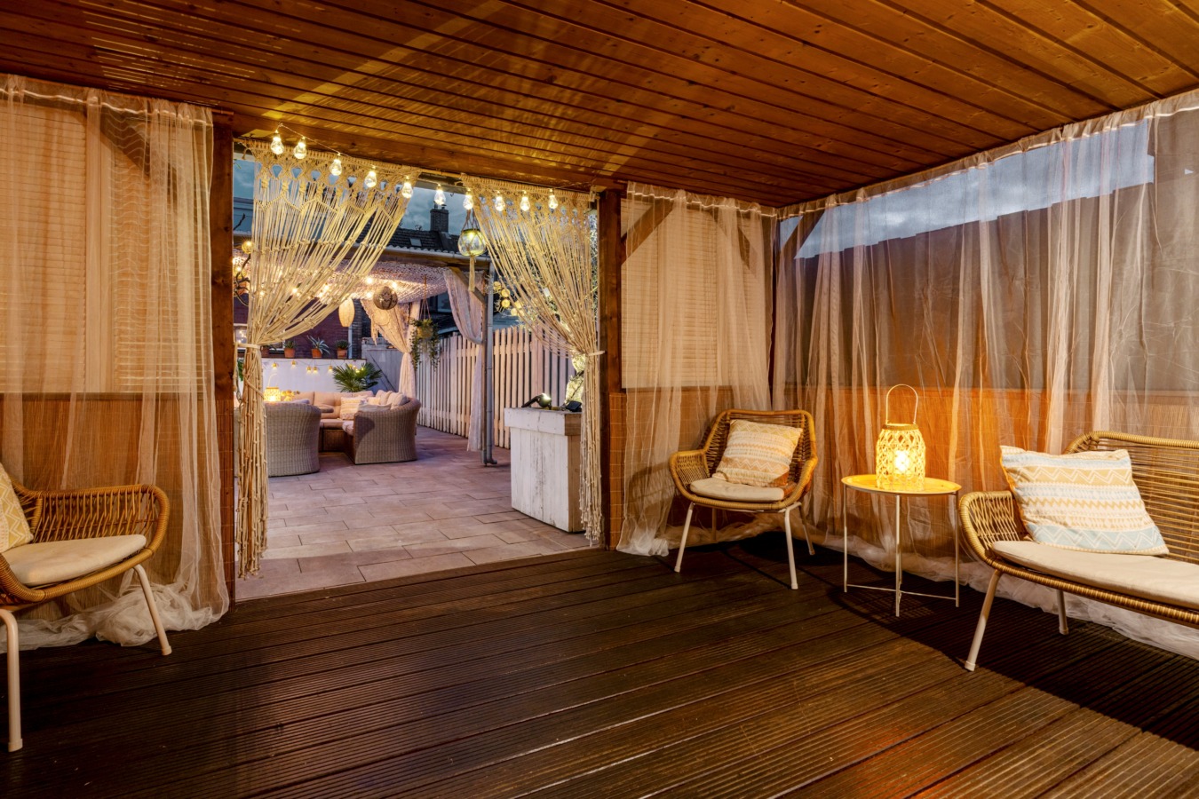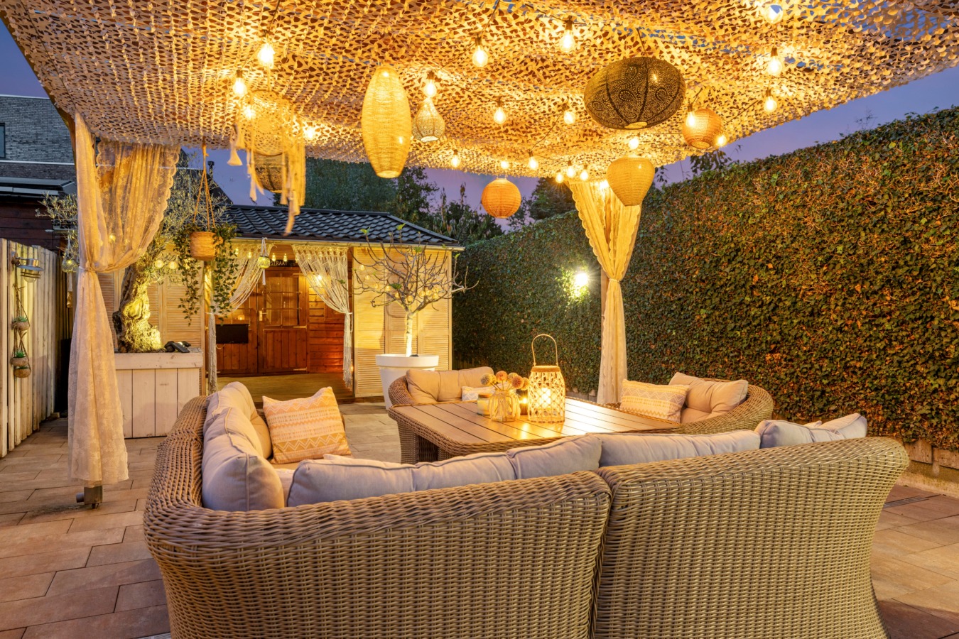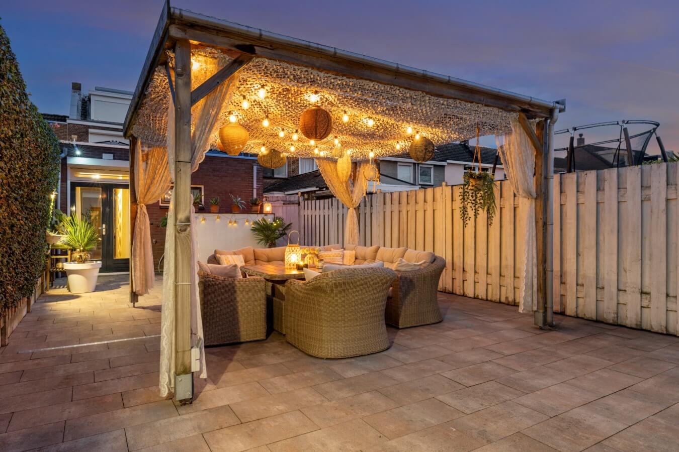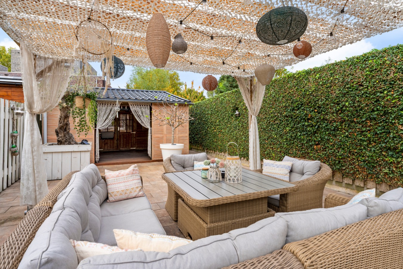 Ook de tuin van deze woning is een absolute eyecatcher te noemen. Je beschikt hier niet alleen over een groot zonneterras, maar ook over een ruime en sfeervolle overdekte veranda: een heerlijke beschutte plek die zich perfect leent voor lange avonden buiten, ook als het regent.