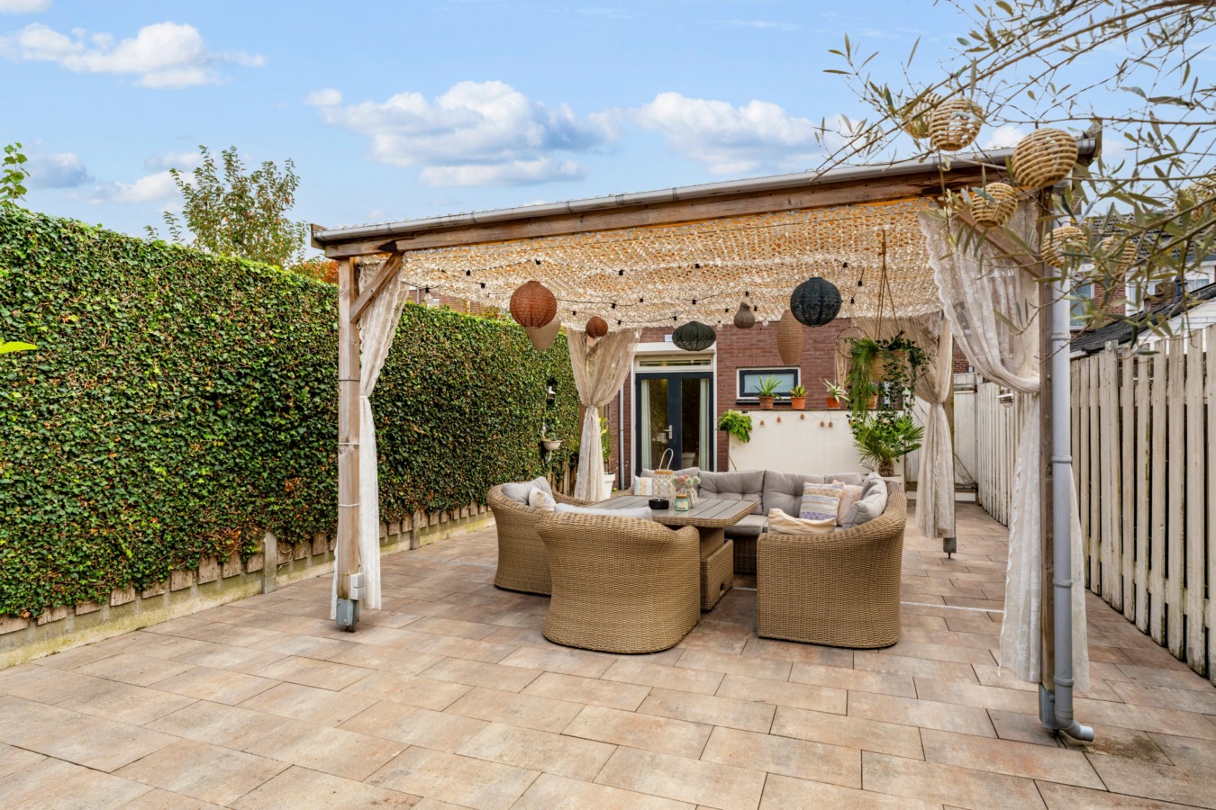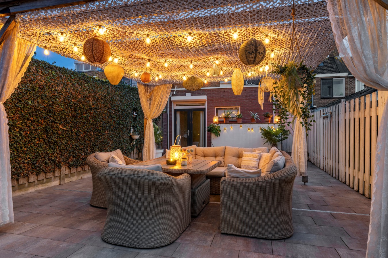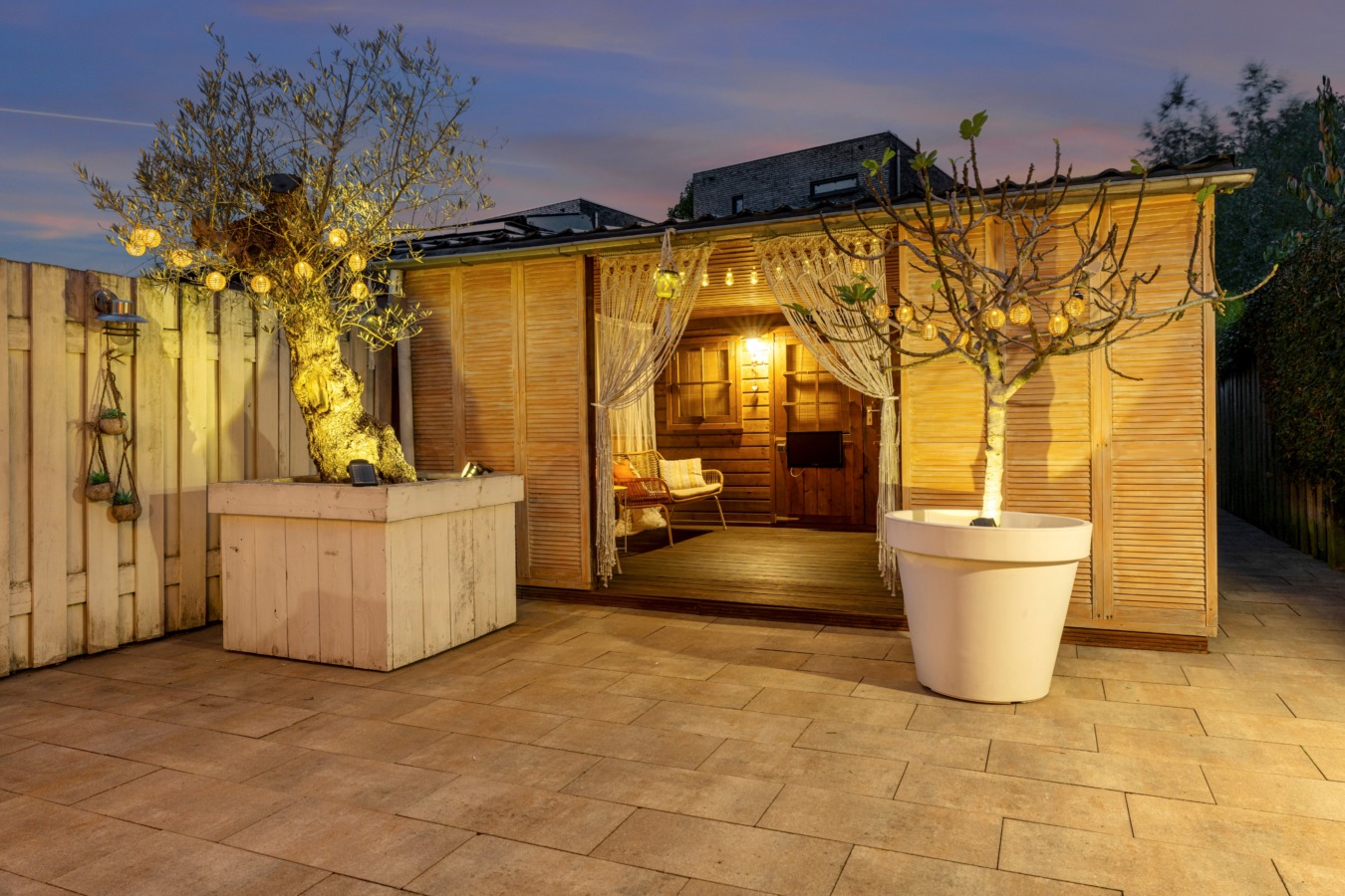 Ook de tuin van deze woning is een absolute eyecatcher te noemen. Je beschikt hier niet alleen over een groot zonneterras, maar ook over een ruime en sfeervolle overdekte veranda: een heerlijke beschutte plek die zich perfect leent voor lange avonden buiten, ook als het regent.