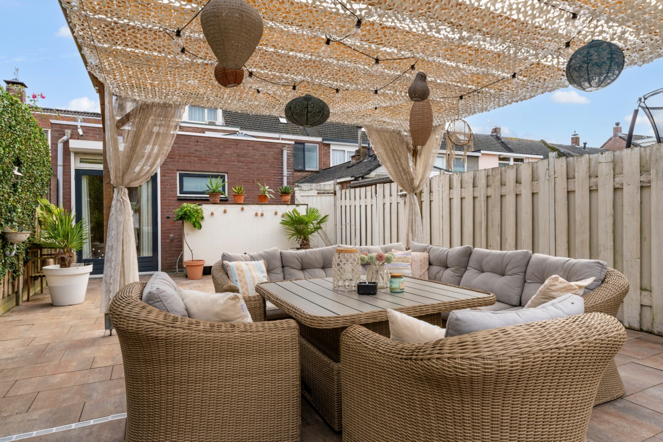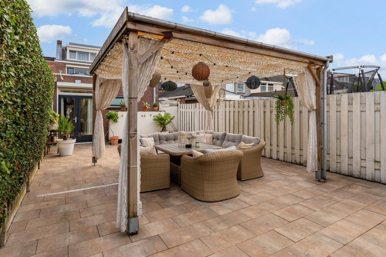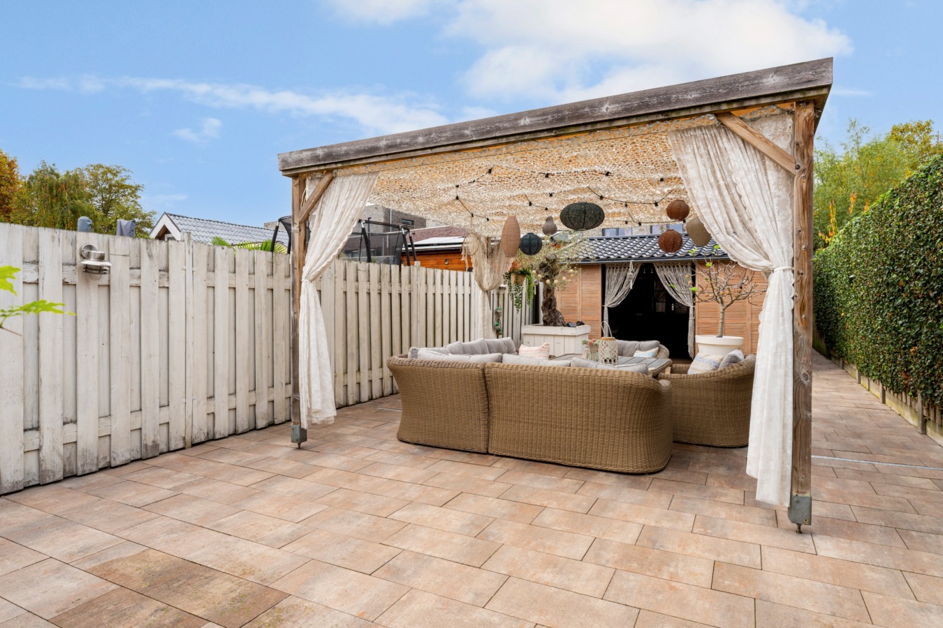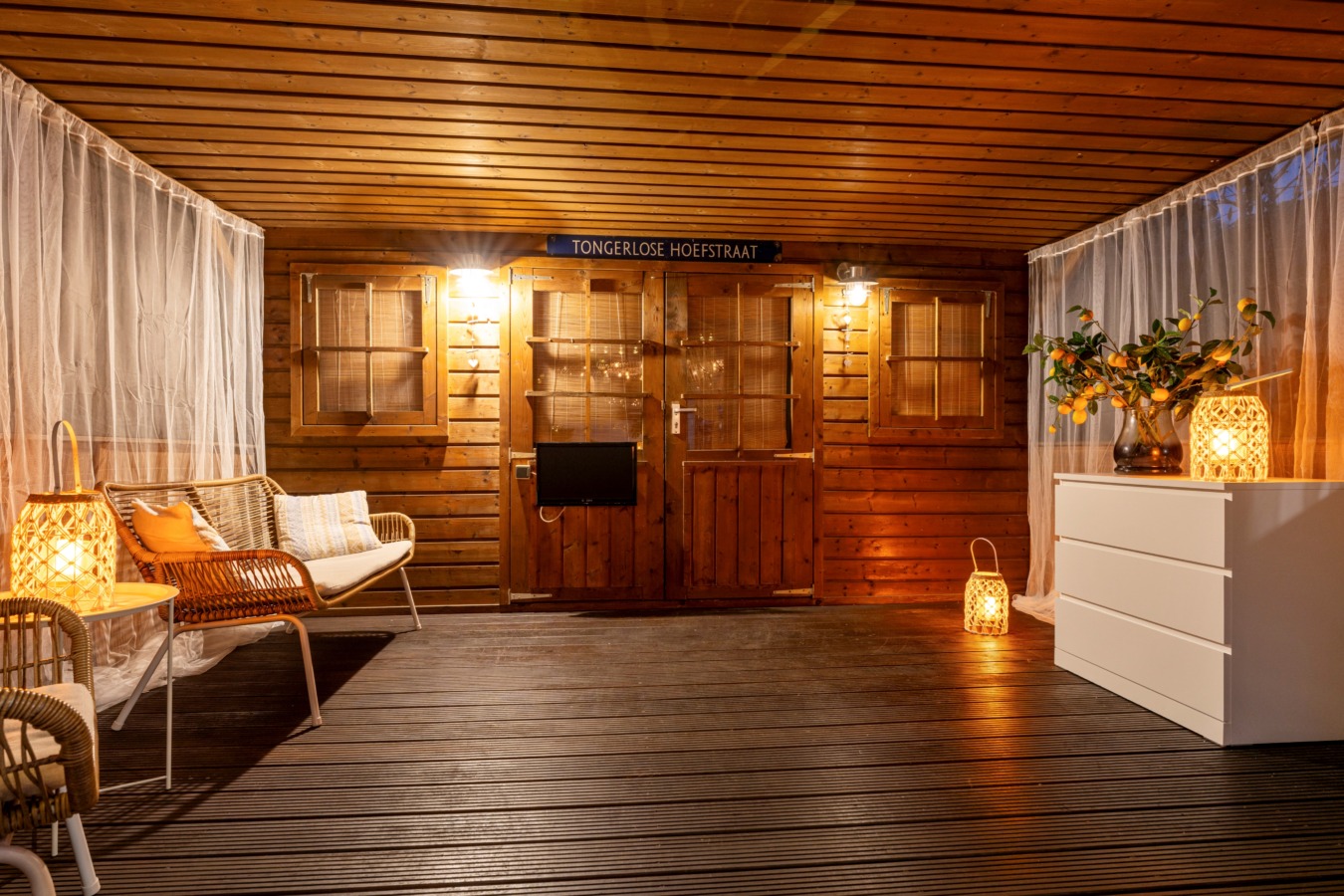 Ook de tuin van deze woning is een absolute eyecatcher te noemen. Je beschikt hier niet alleen over een groot zonneterras, maar ook over een ruime en sfeervolle overdekte veranda: een heerlijke beschutte plek die zich perfect leent voor lange avonden buiten, ook als het regent.
