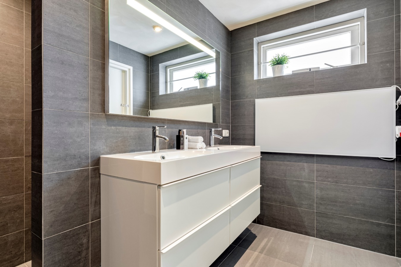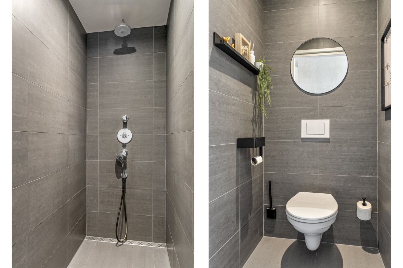 En dan zijn we nog niet klaar met de vertrekken op de begane grond. Achter de keuken bevinden zich namelijk de moderne toiletruimte met hangend closet en de grote badkamer met vloerverwarming, inloopdouche, verwarmde spiegel, dubbele wastafelmeubel, toilet en ingebouwde opbergruimtes. Ook de aansluitingen voor wasapparatuur zijn hier slim verwerkt in een bergkast.