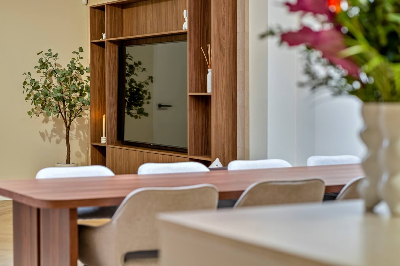 Over de keuken gesproken. Die is werkelijk een droom voor kookliefhebbers, met haar kookeiland, wederom hypermoderne look en feel, bakken aan werk- en bergruimte en high-end apparatuur. Je kookt hier op het allerhoogste niveau, met onder andere Celsius Cooking, een Quooker met bruisfunctie, dubbele combimagnetrons en een grote koelkast. Wedden dat dit een van jouw favoriete plekken in huis wordt?