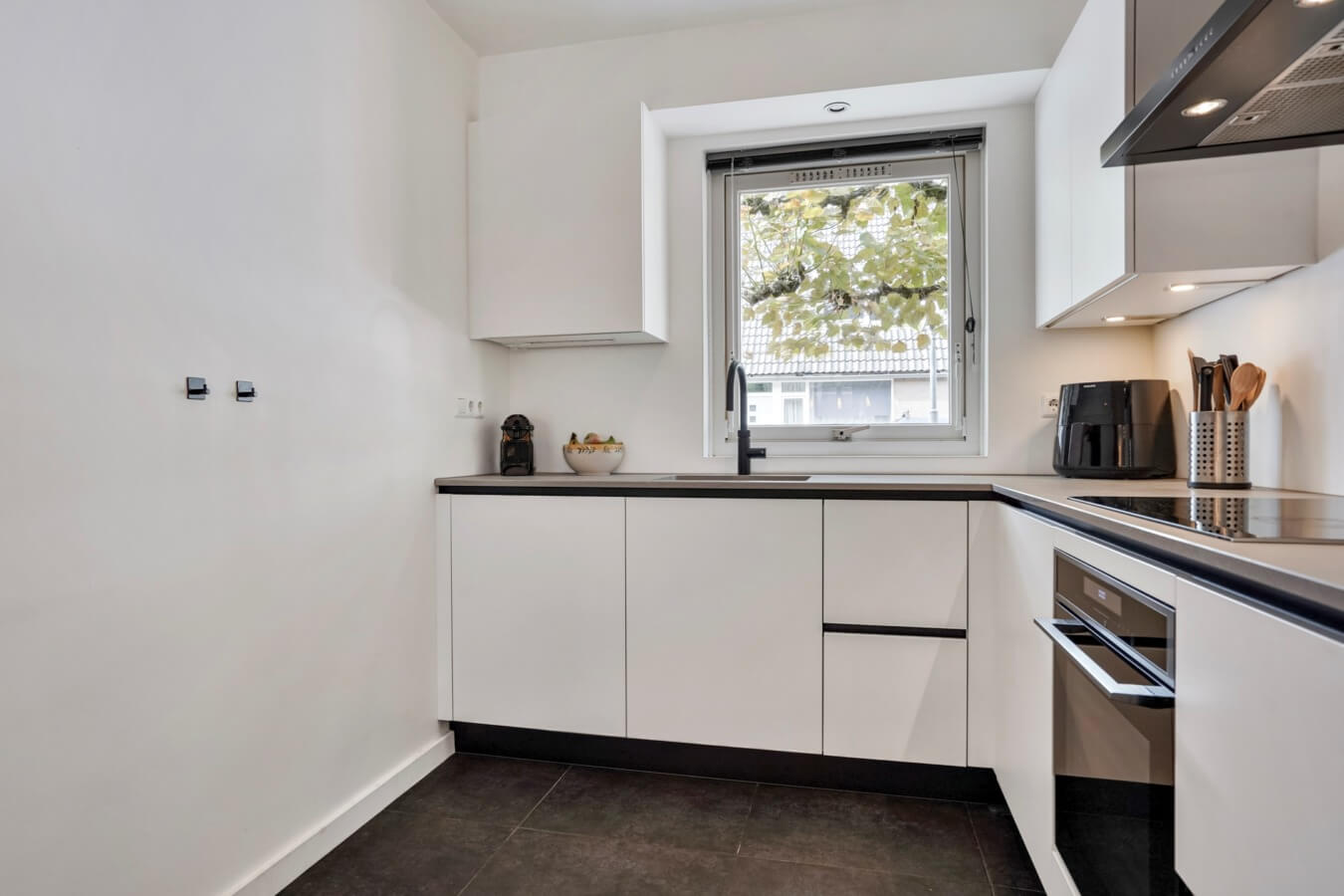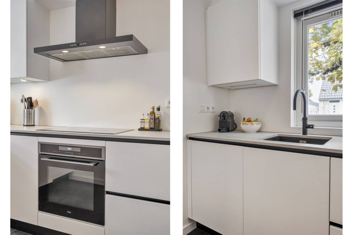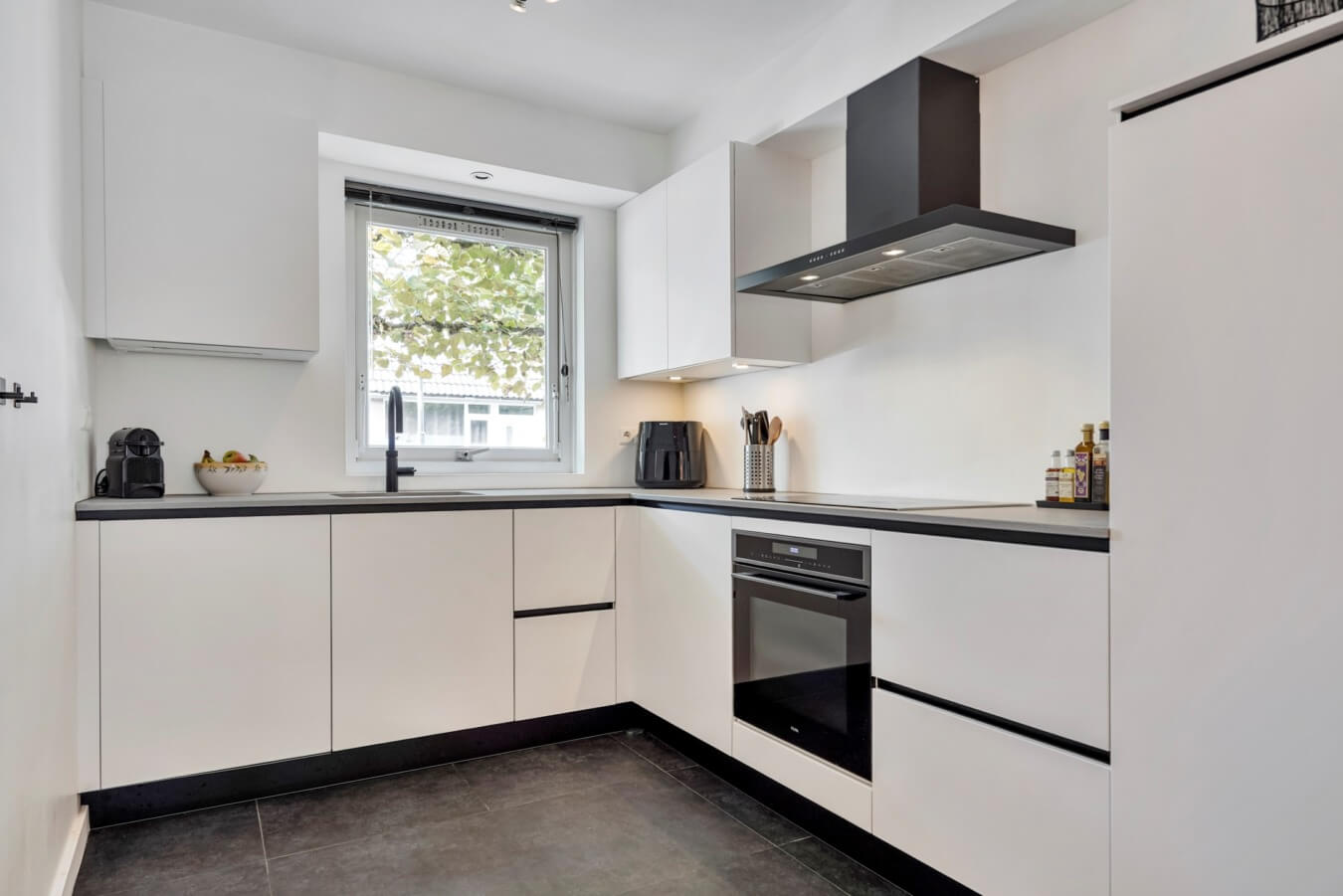 Ook het vertrek in de linkerhoek aan de voorzijde, de open keuken, sluit perfect aan bij het geheel: strak, modern en slim ingedeeld. De keuken is uitgerust met een inductiekookplaat, afzuigkap, vaatwasser, koelkast en een oven. Kortom: alles wat je nodig hebt om de sterren van de hemel te koken voor het gezelschap aan de eettafel (waar je overigens gewoon mee kan blijven kletsen tijdens het kokkerellen).