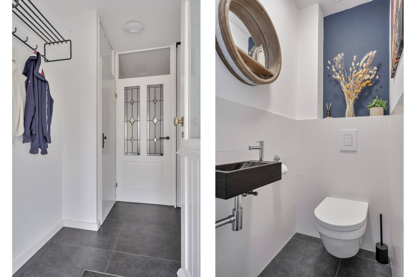 Hoewel het knusse exterieur het hart al sneller laat kloppen, is het de hoogste tijd om de woning te betreden. Een echt warm welkom begint tenslotte bij de voordeur. Je stapt de woning binnen in de nette hal, waar de meterkast en de toiletruimte met hangend closet en fonteintje te vinden zijn. Ook heb je hier toegang tot de living.