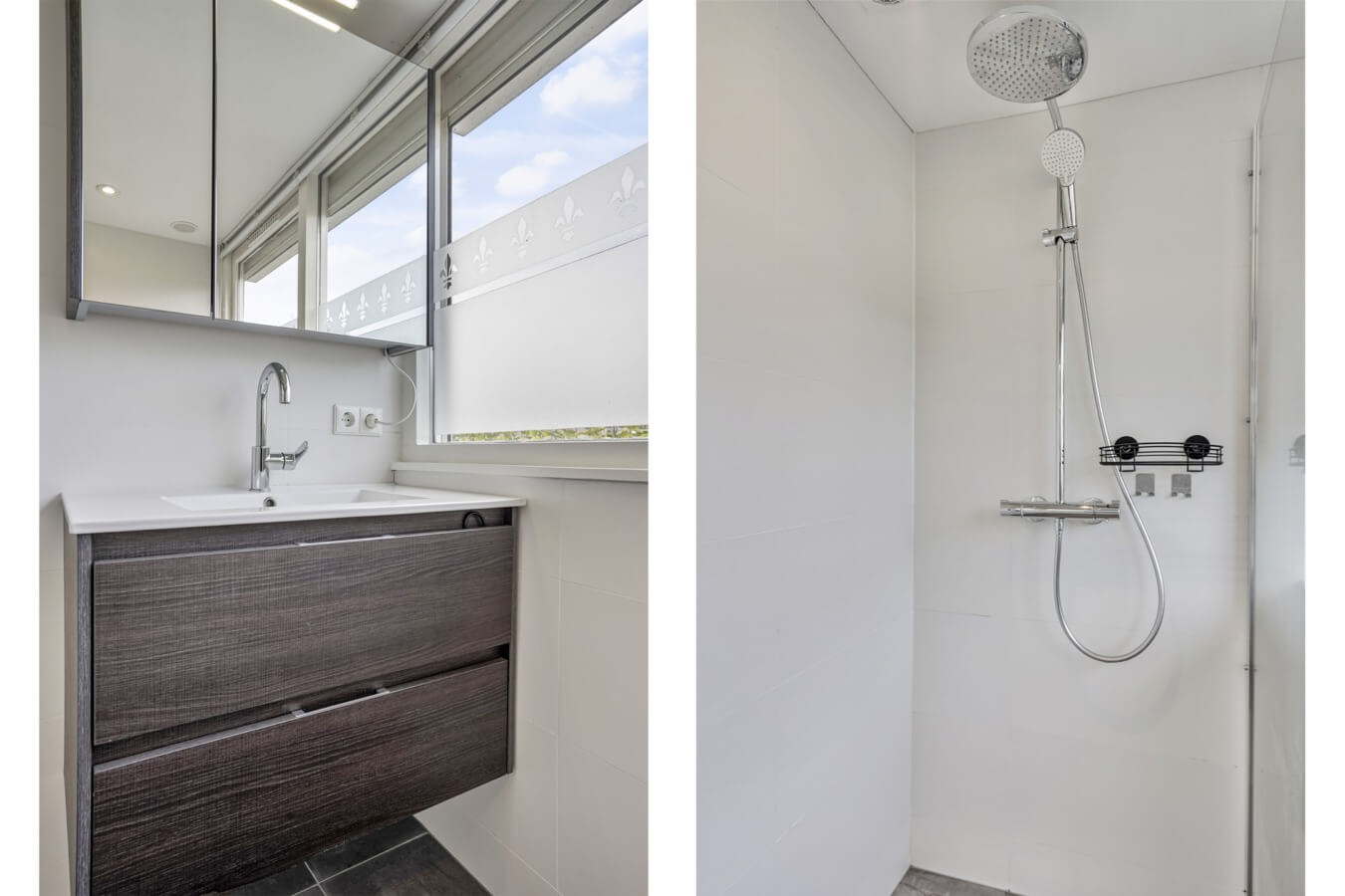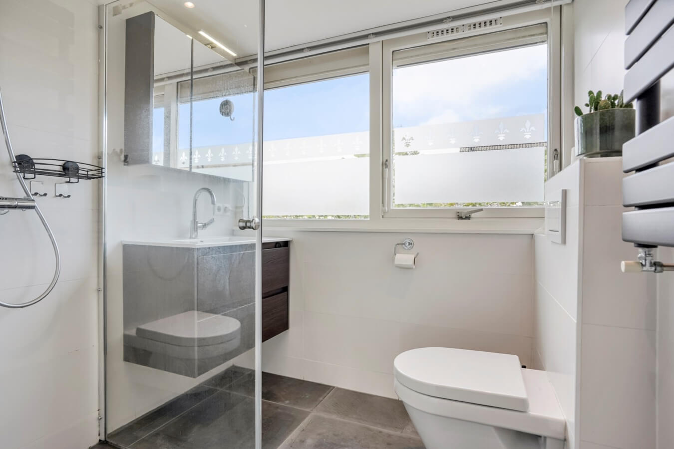 De badkamer heeft een strakke en frisse uitstraling en beschikt over een inloopdouche, een wastafelmeubel, een toilet en elektrische vloerverwarming.