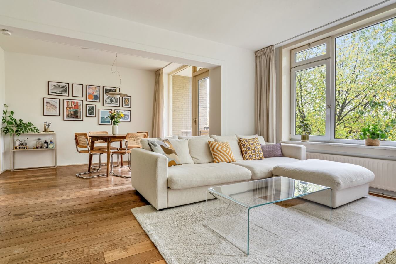 Laten we snel naar het laatste gedeelte van de woning gaan: de living. Dit is het heerlijke hart van het appartement. Je wordt overspoeld door het licht wat door de vele raampartijen binnenvalt, er ligt al een mooie eiken houten vloer op de grond en de ruimte is stijlvol afgewerkt. Verder is de kamer aangenaam ruim, waardoor je de living gemakkelijk kan opsplitsen in een semi-gescheiden zit- en eetgedeelte. Verder stap je vanuit de woonkamer zo het balkon op: een fijne plek om buiten te relaxen met een lekkere kop koffie, een goed glas wijn of een leuk boek. Genieten geblazen van het fraaie groene uitzicht!