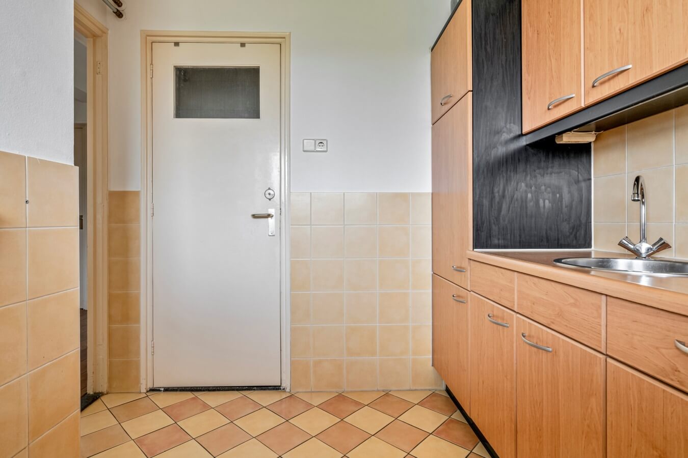 Het eerste vertrek aan de andere kant van de hal is de separate keuken. Deze komt in warme en huiselijke look en feel en is voorzien van diverse inbouwapparatuur. Vanuit hier heb je tevens toegang tot de badkamer met douchecabine en wastafelmeubel.
