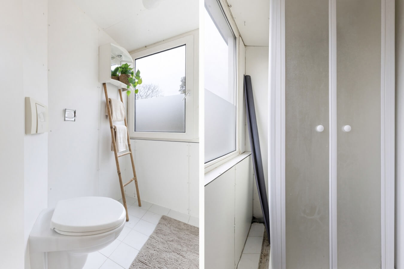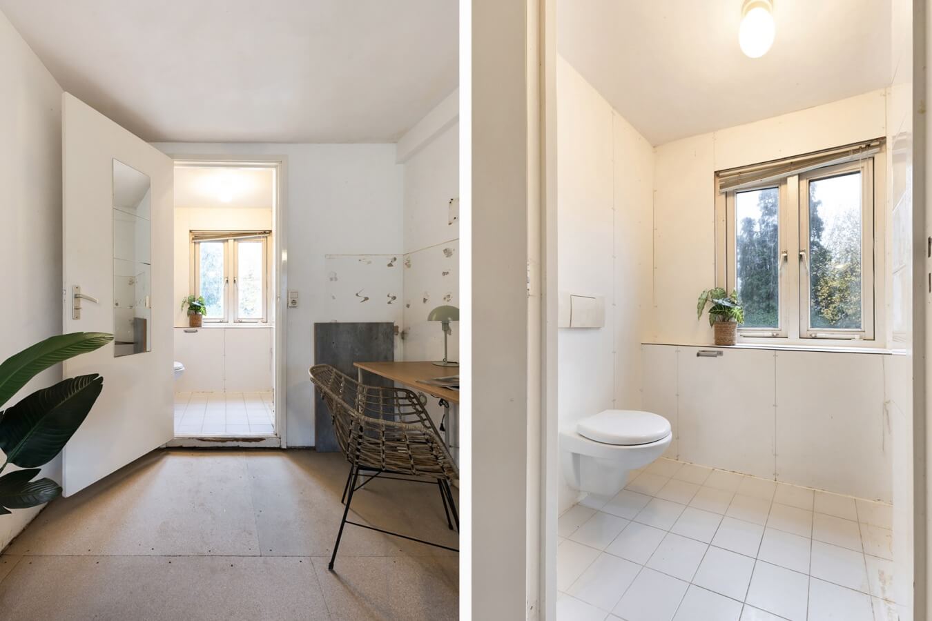 Verder heb je vanuit de keuken enerzijds toegang tot de meterkast en de eerste badkamer van de woning. Laatstgenoemde kan verwijderd worden, waardoor je gemakkelijk de keuken kan uitbreiden of een ander soort ruimte kan realiseren.