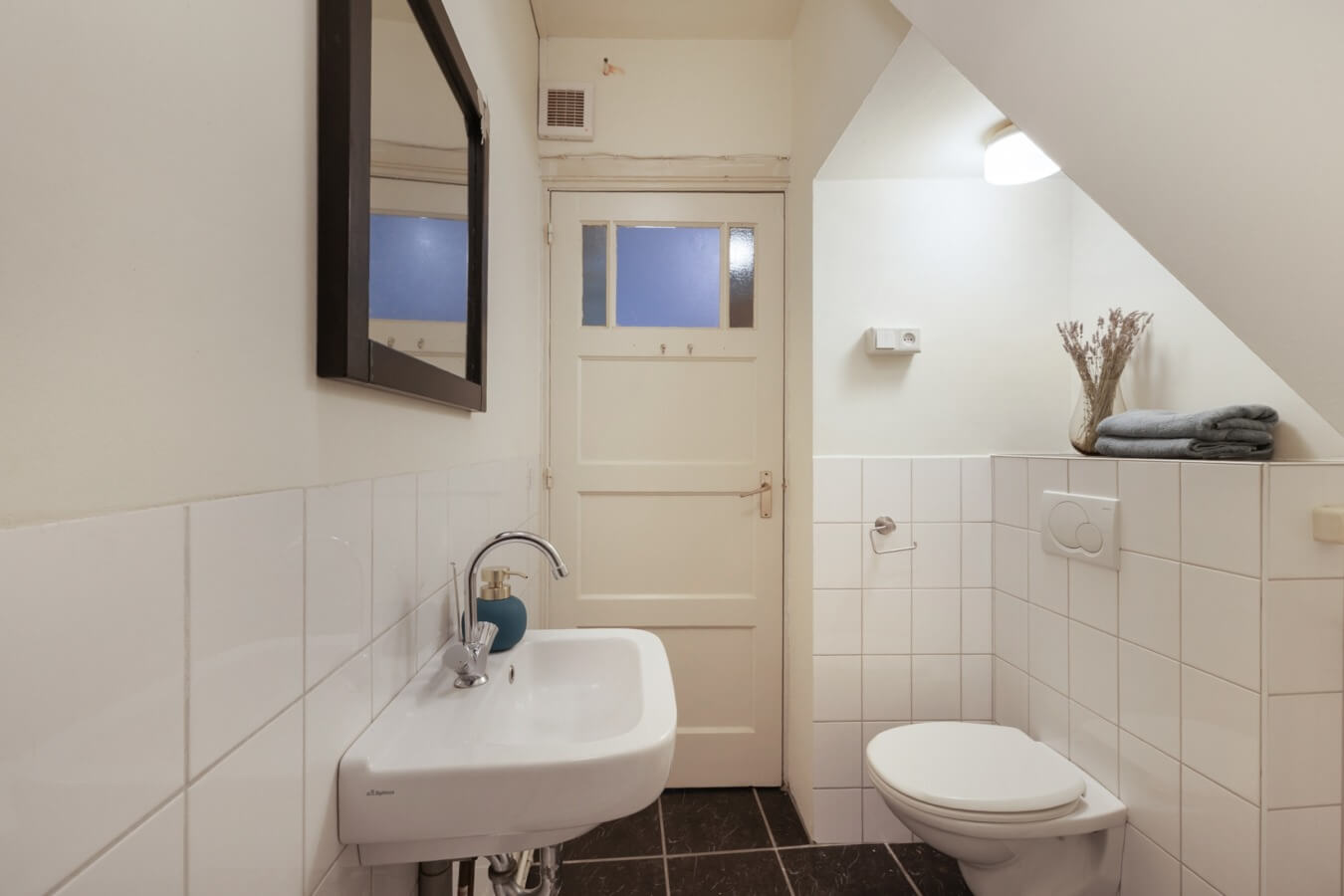 Aan de andere kant van de keuken heb je toegang tot een tussenportaal, die op haar beurt weer toegang biedt tot een kast met de cv-ketel, de inpandige berging, de separate toiletruimte met hangend closet en fonteintje en de eerste slaapkamer van de woning.