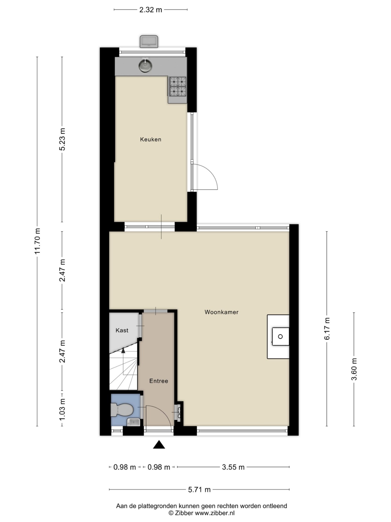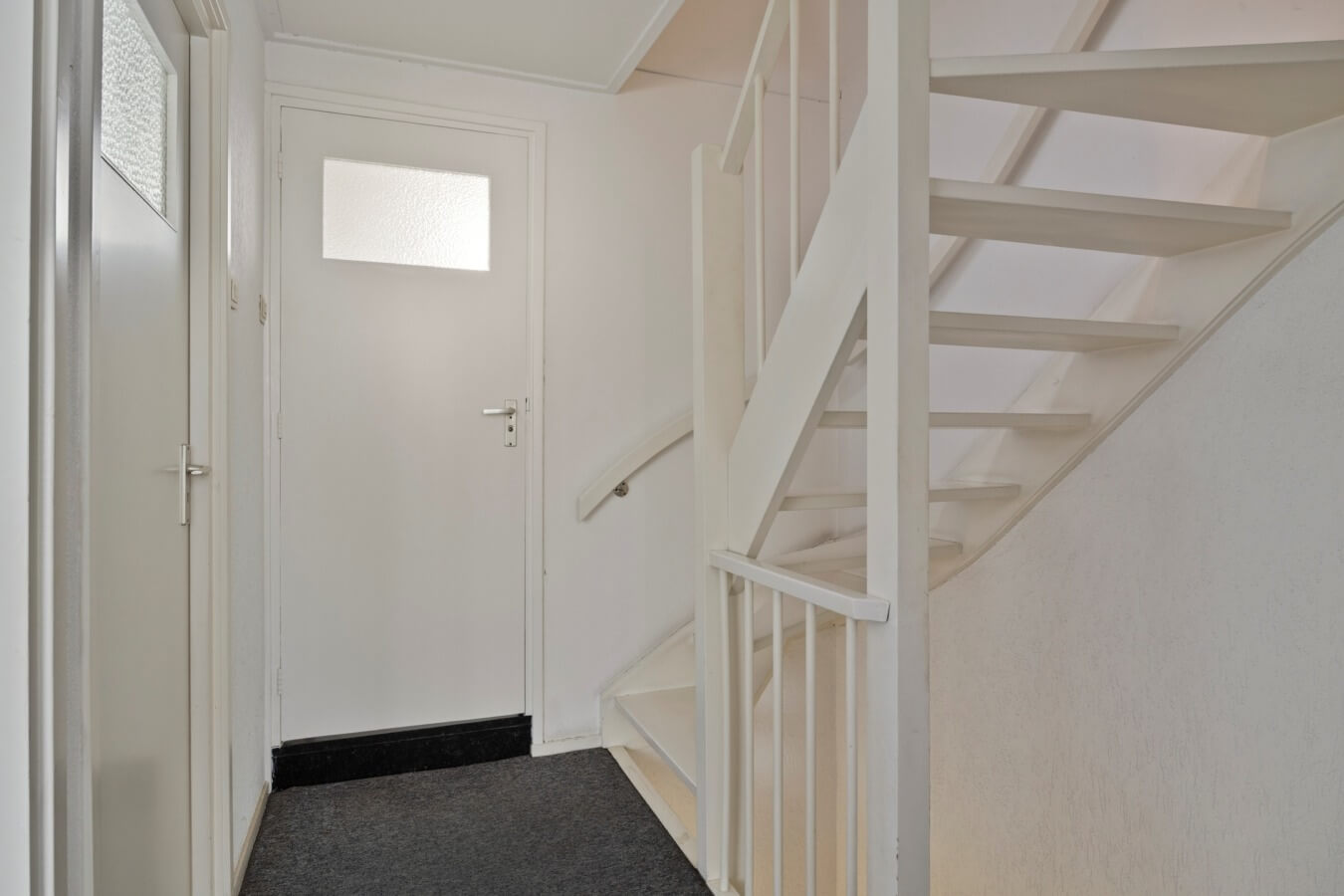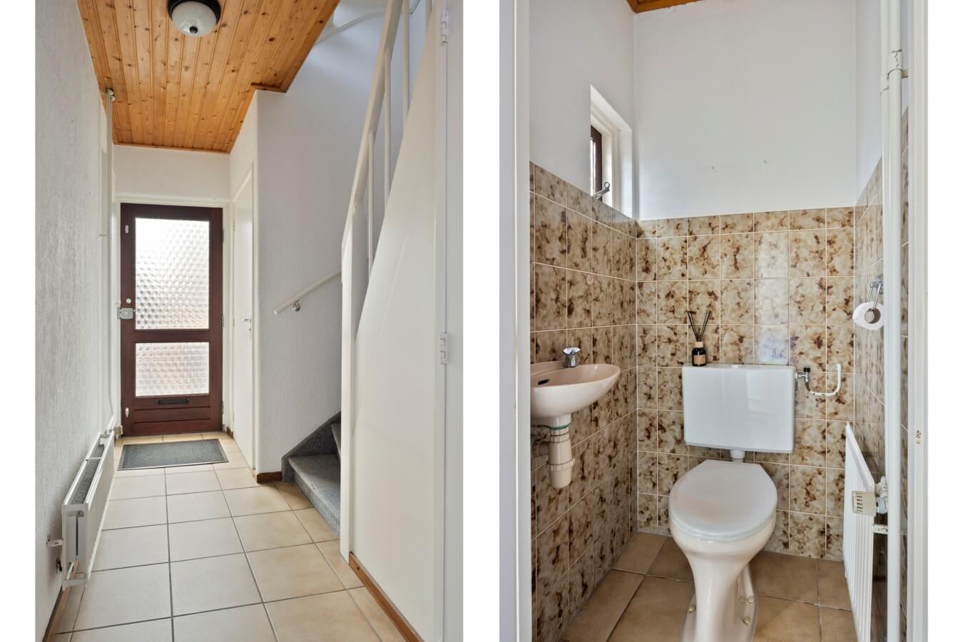 Je komt binnen in de hal met de vernieuwde meterkast, de trapopgang, de handige verdiepte trapkast en de toiletruimte met fonteintje. Ook heb je vanuit hier toegang tot de woonkamer.