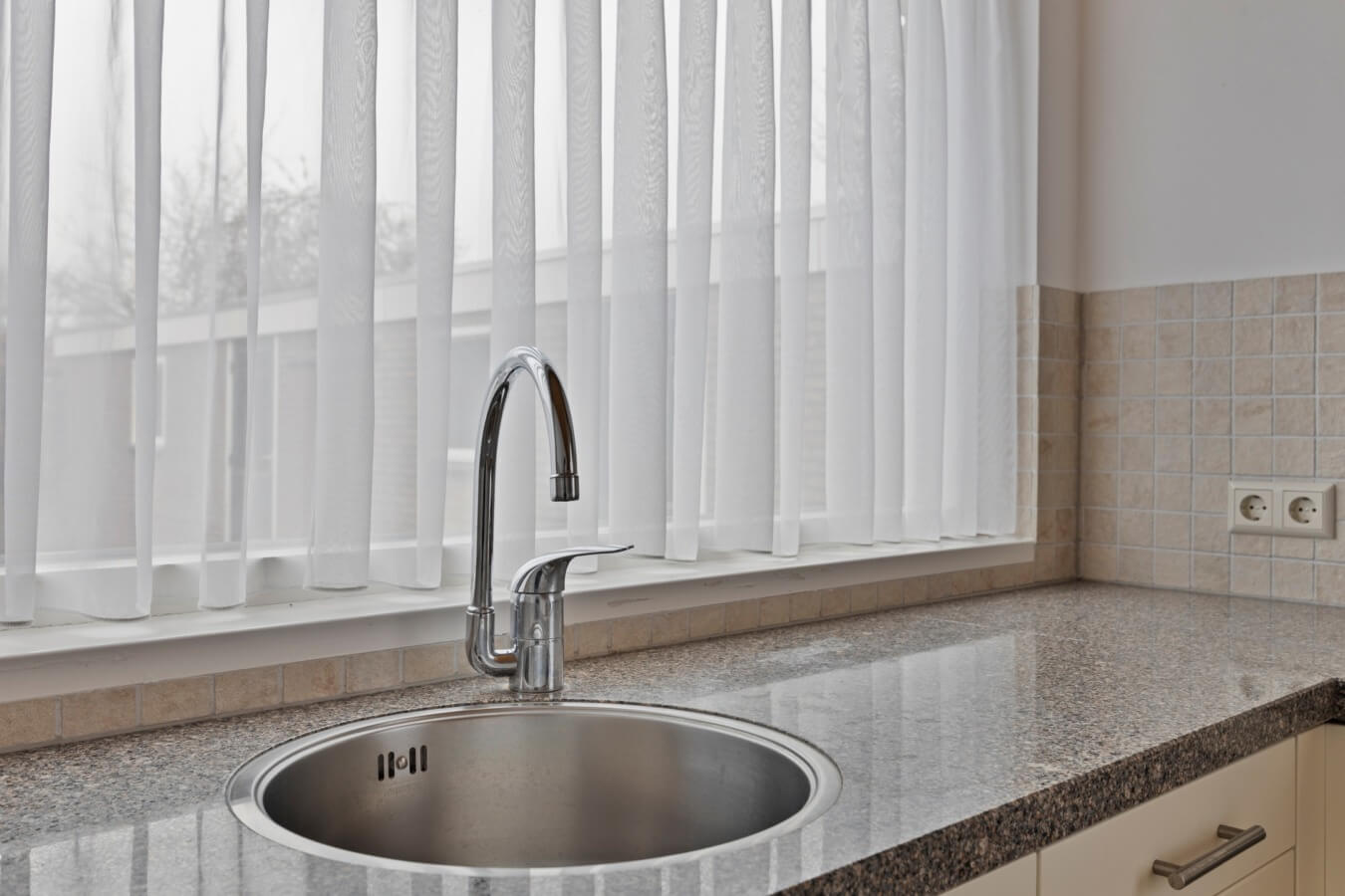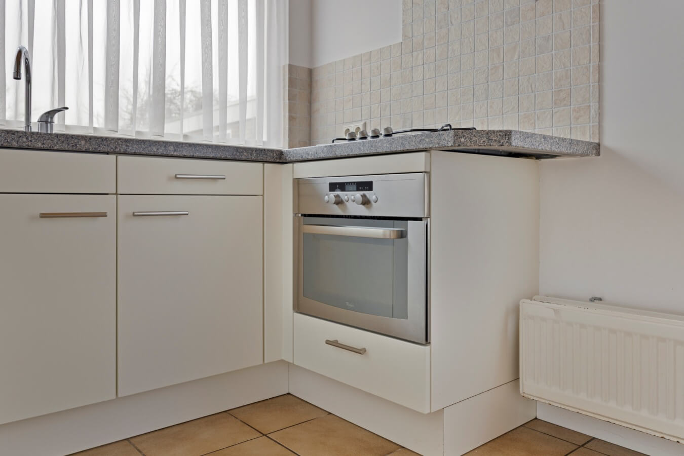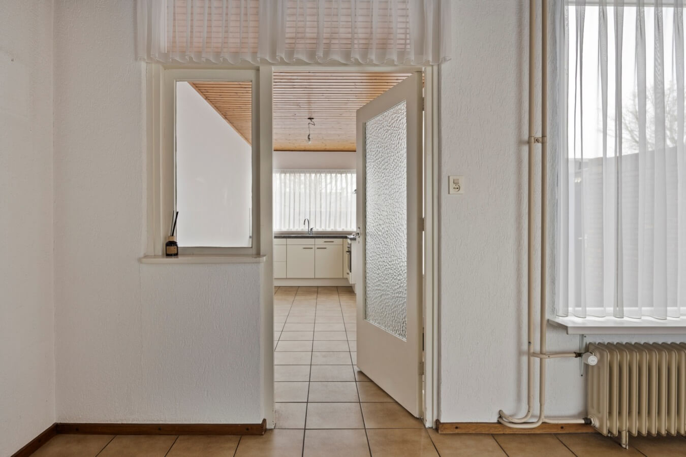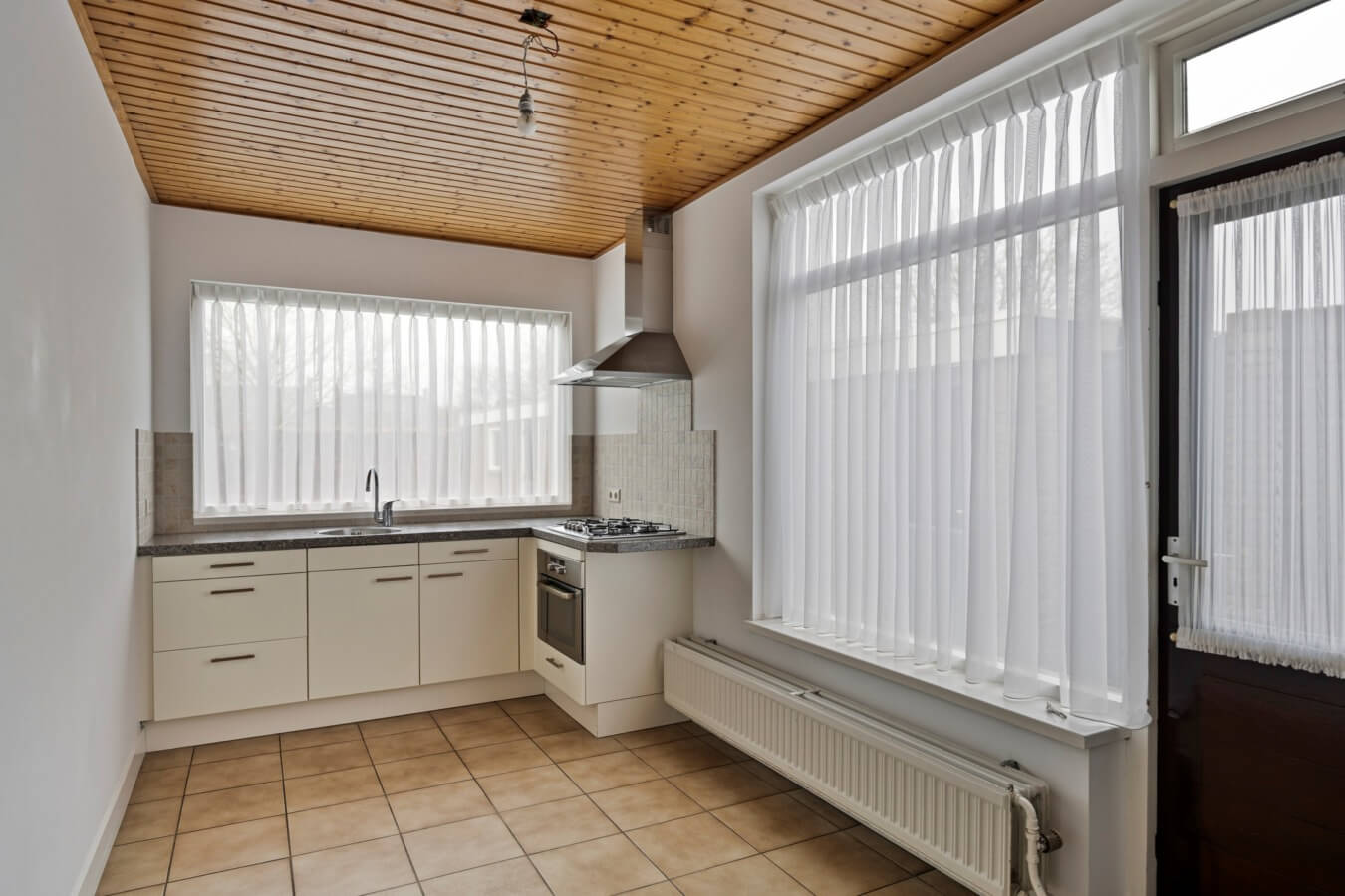Het volgende vertrek, de eenvoudige maar ruime keuken (met een combimagnetron, 4-pits gaskookplaat, afzuigkap en aansluitingen voor wasapparatuur), verdient tevens een upgrade, maar heeft absoluut de ruimte en mogelijkheden om jouw droomkeuken te worden. Ook ontdek je hier de deur naar de tuin.
